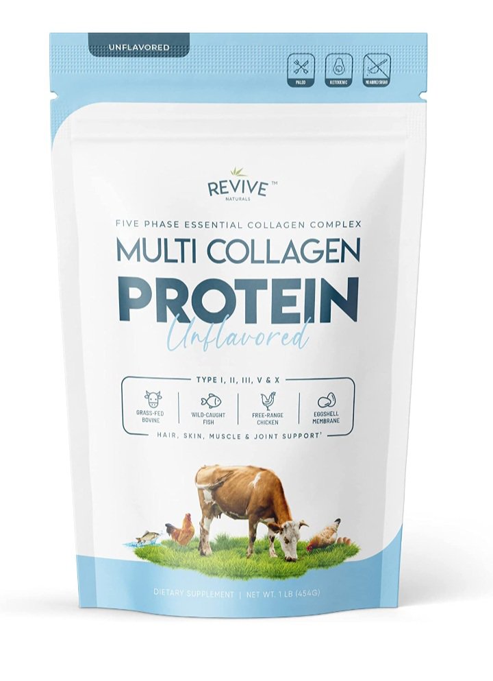REVIVE has five types of collagen. It has grass-fed bovine, Wild Caught Marine, Free Roaming Chicken & Eggshell Collagen Peptides. It is also Non-GMO and gluten-free.