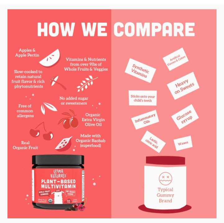 It’s almost impossible to find a healthy kids’ multivitamin. I searched and searched and was happy to finally find LLAMA NATURALS! Sad to say that most kids vitamins I found have waxes, artificial flavors, inflammatory oils, synthetic vitamins or 3 to 5 grams of cane sugar in their ingredients list, which pretty much defeats the purpose of giving kids vitamins.